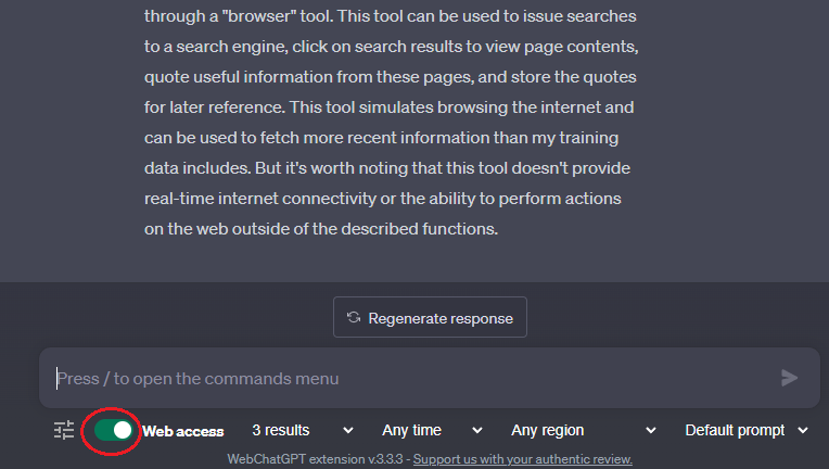 Kan jeg deaktivere webadgang for ChatGPT, når jeg har tilføjet WebChatGPT-udvidelsen?Ja, du kan nemt slå webadgang til og fra i overensstemmelse med dine behov og effektivt returnere ChatGPT til standardtilstanden, når det foretrækkes.