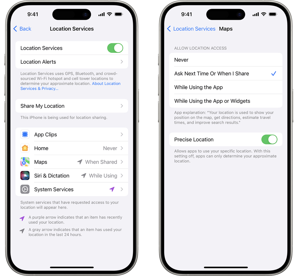 - Tryk påLokationsservices, hvor du kan se detaljerne om appss placeringskrav.