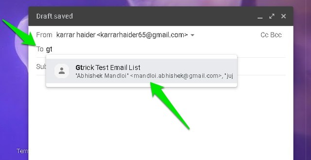 I den"Til"sektion, skal du indtaste initialerne på navnet på den e-mail-liste, du lige har oprettet. En autofyld-menu åbnes med e-mail-listen på listen. Klik på den for at vælge den.