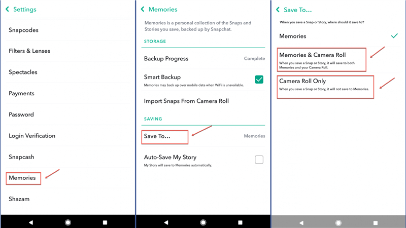 - Sikkerhedskopier hukommelser:Åbn Snapchat > profilikon >Minder. Gem vigtige snaps og historier på din kamerarulle eller sørg forSmart Backuper tændt.