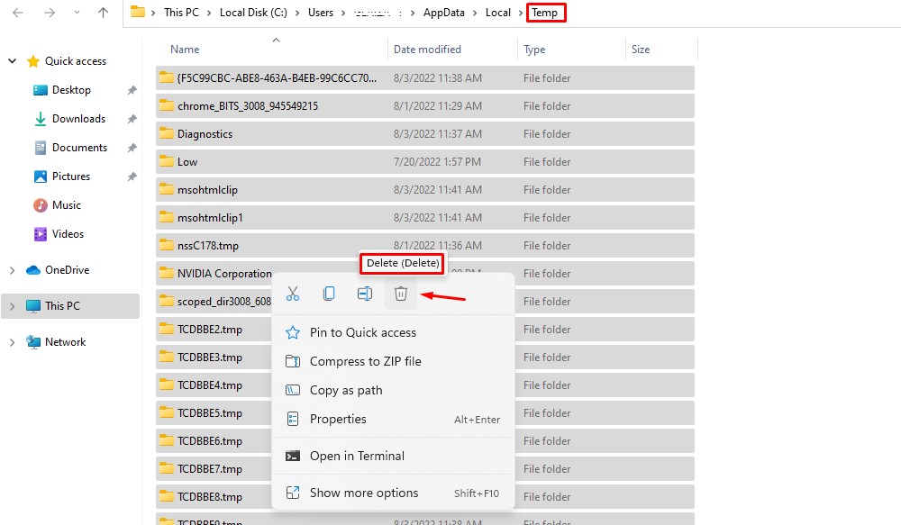 Trin 3: Vælg alle mapper og filer iTemp mappedu agter at fjerne. Det er tilrådeligt at fjerne dem, hvis du ikke har en særlig grund til at beholde nogen filer.