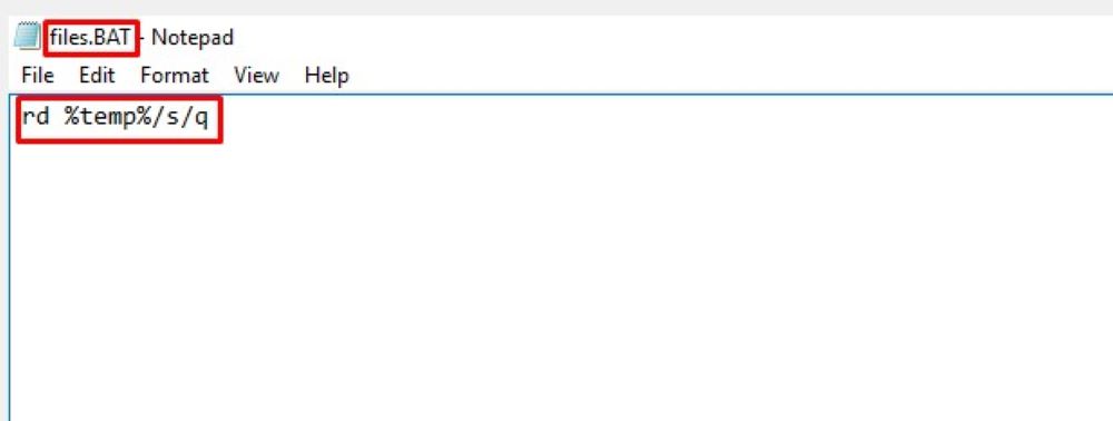 Trin 2: Indtast følgende kommando i din Notesblok eller andre teksteditorer"rd %temp% /s /q"uden citater. Gem den derefter med filtypen .BAT.