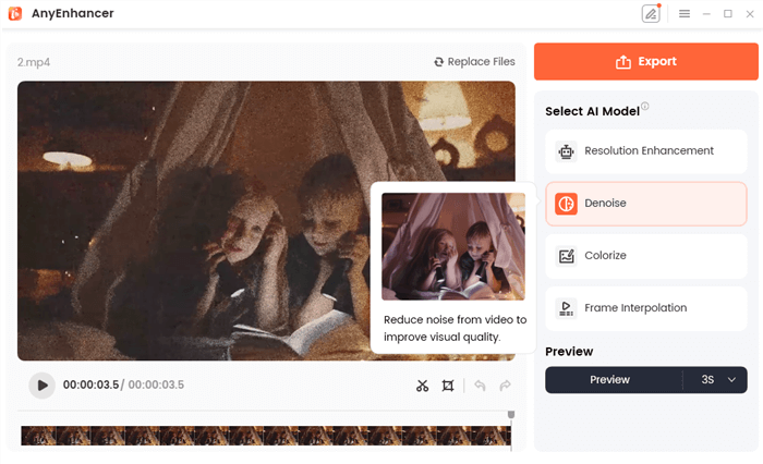 Denoise-modellen fjerner korn og artefakter fra videoer. Det er især nyttigt til videoer med lavt lys eller høj ISO. Denne funktion gør dine videoer klarere og mere tiltalende.