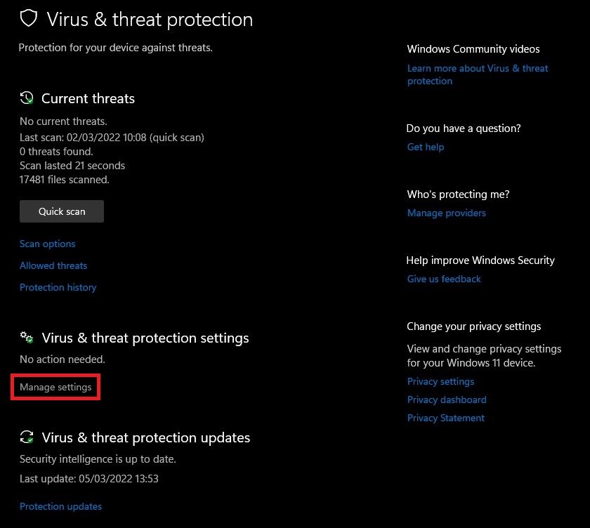Klik på i dette vindueAdministrer indstillingerunderVirus- og trusselsbeskyttelsesindstillinger.