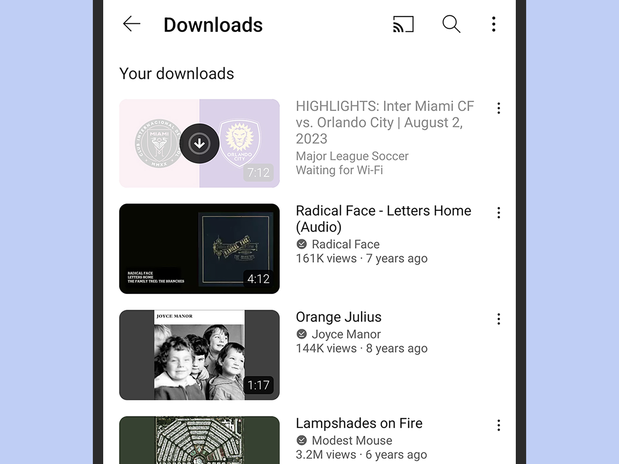 Som på en computer bliver disse downloads ikke gemt som separate videofiler, men som data, som kun YouTube-appen kan fortolke – så du kan ikke åbne downloadede videoer i en anden videoapp på din enhed. For at se videoer, der er blevet downloadet eller downloades i øjeblikket, skal du åbneBibliotekfanen og vælgDownloads.
