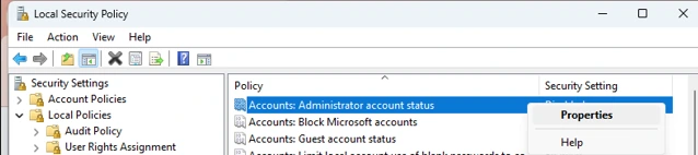 Trin 4: I det højre panel skal du finde og højreklikke på "Konto: Administratorkontostatus”.