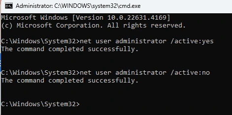 Bemærk:Det er vigtigt at deaktivere denne administratorkonto, ellers kan alle med administratoradgang gå ind på din pc og foretage ændringer. For at deaktivere skal du kopiere og indsætte denne kommando ved at gå til din tidligere konto i kommandopromptvinduet.