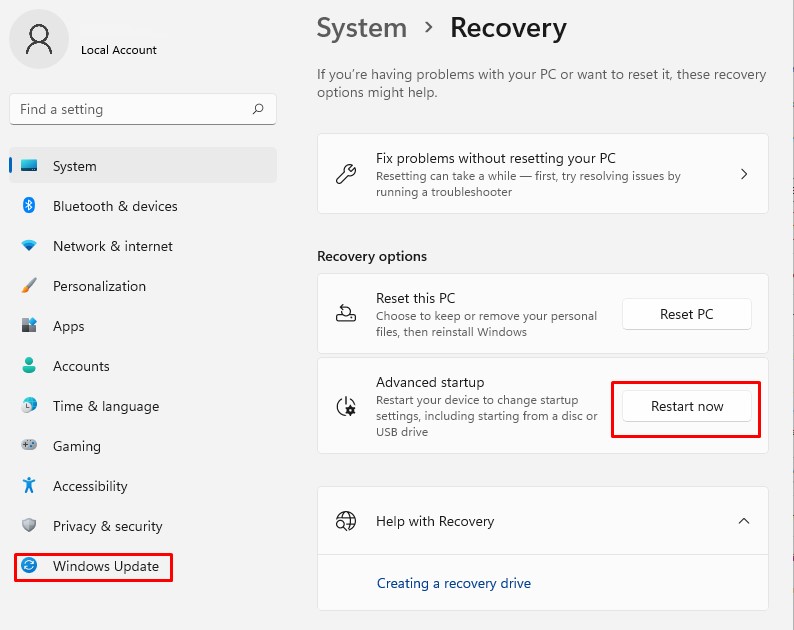 Trin 3: Du finder den avancerede opstartsmulighed. Klik på GENSTART NU