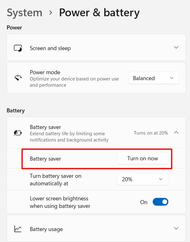 Trin 4: vælg muligheden for at sænke skærmens lysstyrkeniveau, når du er i strømbesparende tilstand.
