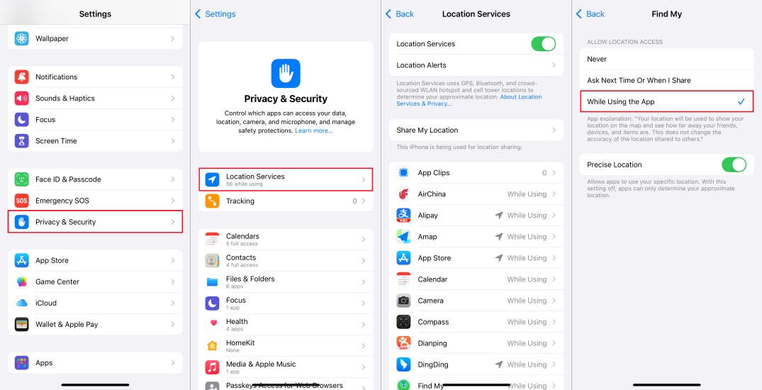 Trin 1.Gå tilIndstillinger > Privatliv og sikkerhed > Placeringstjenester, hvor du kan se en liste over apps og deres adgangsniveauer.