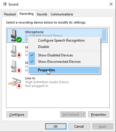 - Højreklik på mikrofonen og vælg Egenskaber.