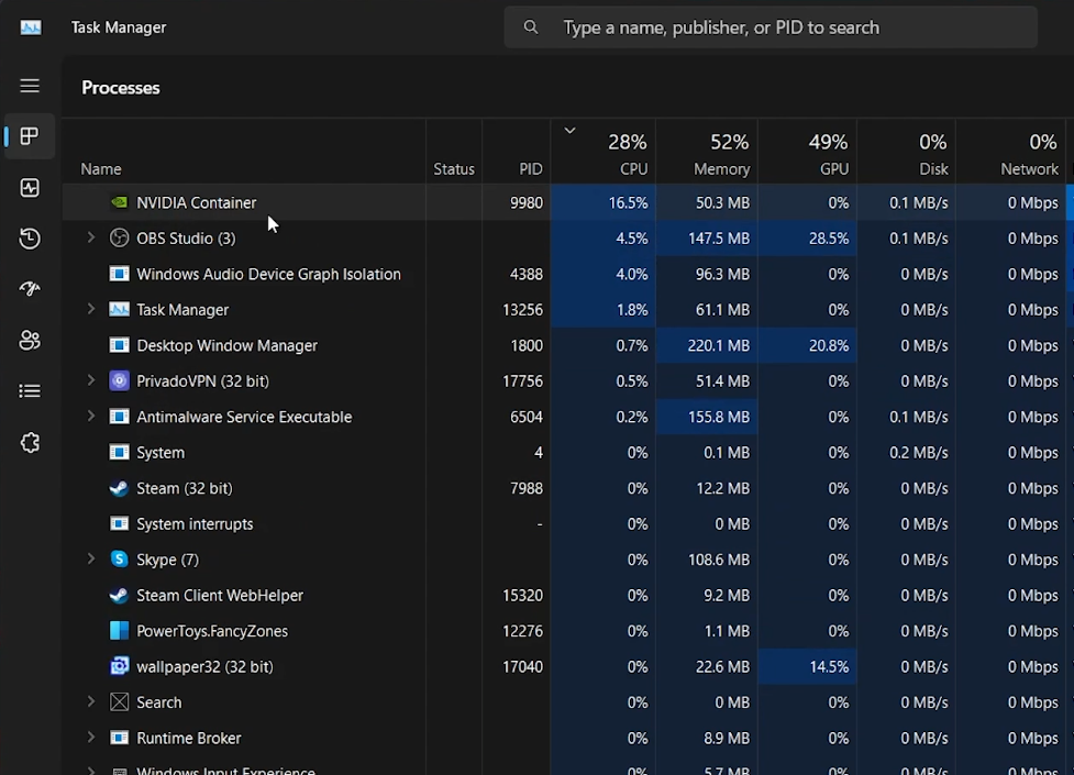 Identificer ressourcekrævende programmer:I Task Manager's Processes-fanen skal du se efter programmer, der bruger høj CPU eller hukommelse.