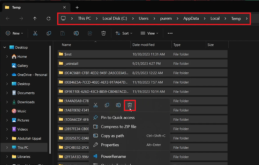 Slet unødvendige filer:Dette åbner mappen, hvor midlertidige filer er gemt. Slet sikkert de fleste filer her for at frigøre plads.