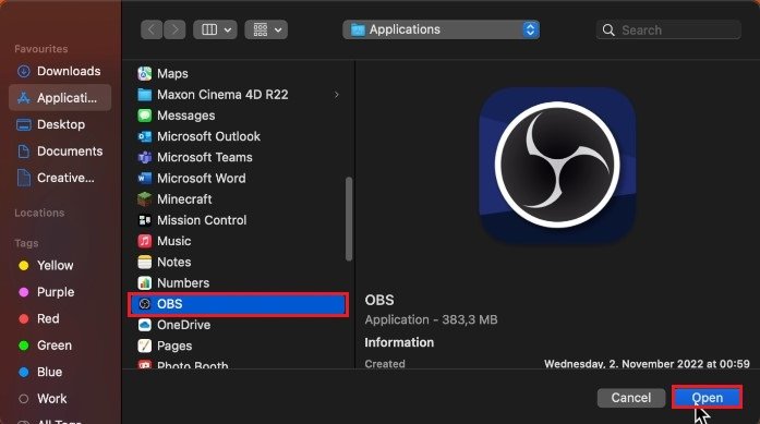 Hvis OBS ikke vises på denne liste, skal du klikke på plusikonet, som åbner dit søgevindue. Naviger tilAnsøgningerog vælg åben OBS på denne liste.