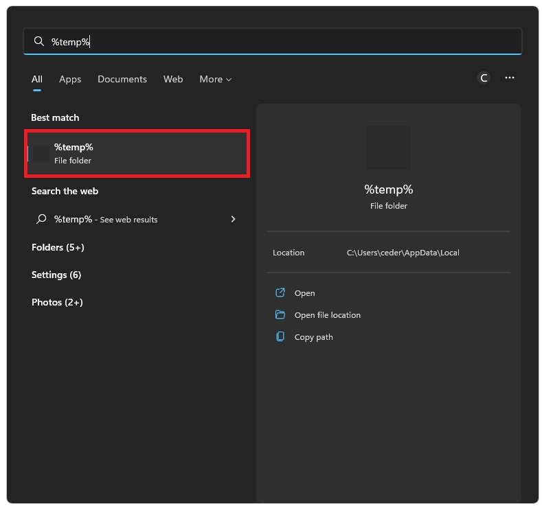 Du bør slette dine midlertidige filer, når dette er gjort, da dette har hjulpet nogle brugere med at rette fejlen "uventet klientadfærd" for Roblox. Søg efter%temp%i din startmenu søg og tryk enter.
