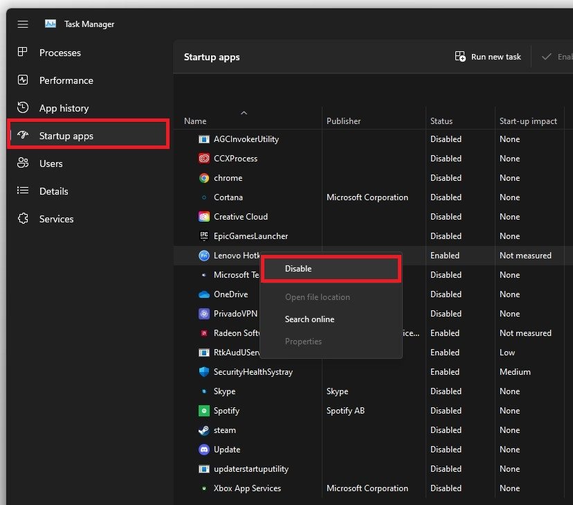 Task Manager > Startup Apps