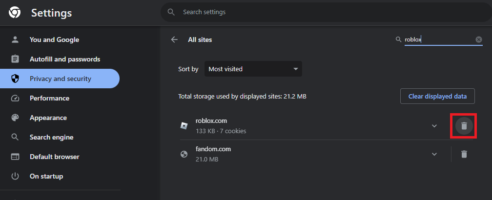 Slet Roblox-data:Skriv "roblox" i søgefeltet, og fortsæt med at slette dine Roblox.com-webstedsdata og cookies.