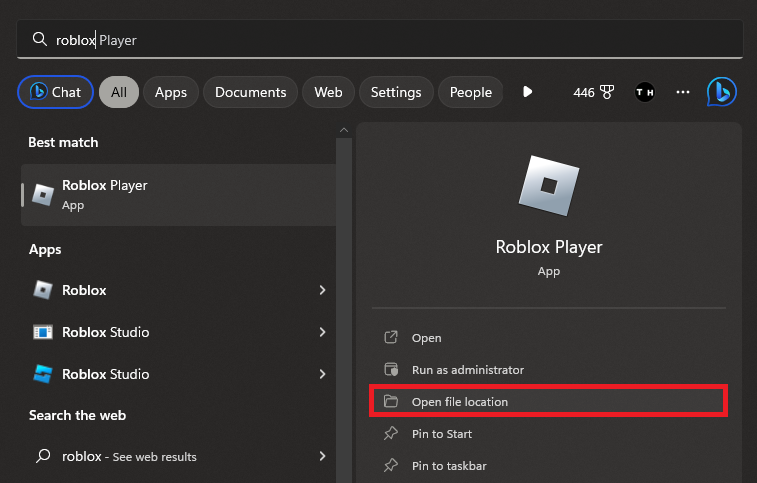 Find Roblox Player-appen:Brug din startmenusøgning til at finde "Roblox", højreklik derefter på genvejen til Roblox Player og vælg "Åbn filplacering."
