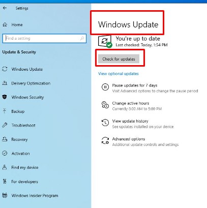 Trin 3:Vælg derefter "Se efter opdateringer” iWindows Updatedialog box.