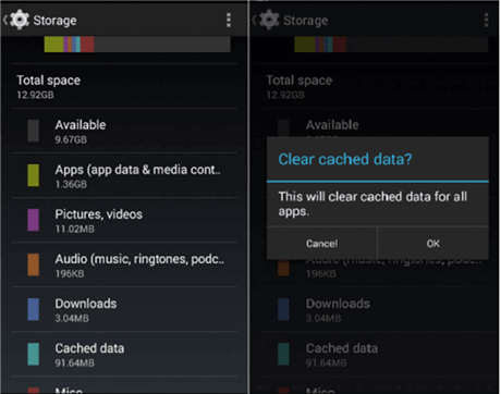 Når du får adgang til menuen Lager og derefter åbner vinduet Internt lager, kan du slette alle cachelagrede filer på din enhed. På den anden side giver vinduet Apps & Notification dig mulighed for at vælge de apps, hvorfra du vil slette data og cache.