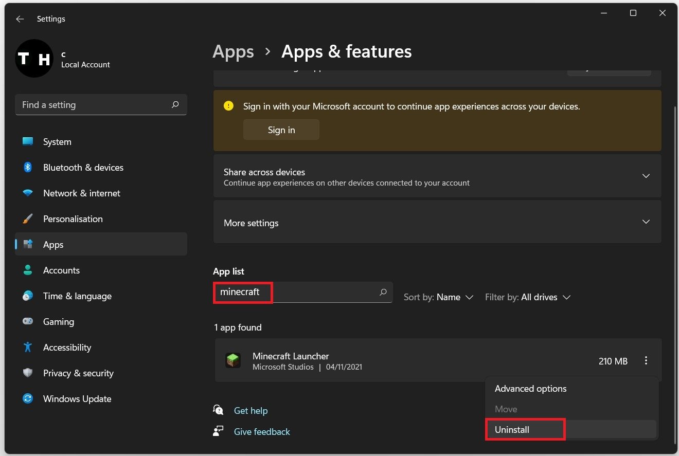 Sørg for, at din tidligere Minecraft launcher er afinstalleret. Søg efterAfinstallerellerAppsi din startmenu eller søg på proceslinjen for at finde dinApps og funktionervinduet med systemindstillinger. Du vil se en komplet liste over installerede apps på dit system. Filtrer listen efter alle drev, og søg efter Minecraft for at finde dinMinecraft Launcheranvendelse. Klik på burgermenuen i højre side og vælgAfinstaller. Dette vil tage et minut at afinstallere den gamle Minecraft launcher fra dit system.