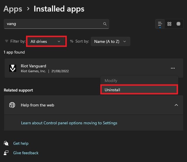 Her skal du sørge for at filtrere din søgning efter alle drev og slå Vanguard op. Klik derefter på burgermenuen forRiot Vanguardog vælgAfinstaller. Det kan tage et par sekunder at afinstallere Riot Vanguard fra dit system.