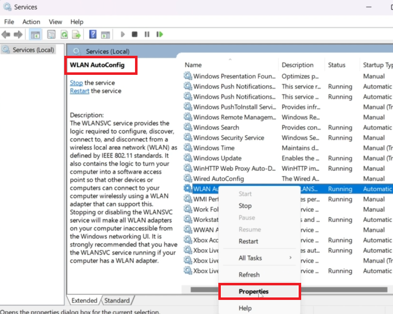 Trin 2:Begynd at skrive "WLAN AutoConfig" for hurtigt at finde tjenesten, og højreklik derefter for at få adgang til dens egenskaber.