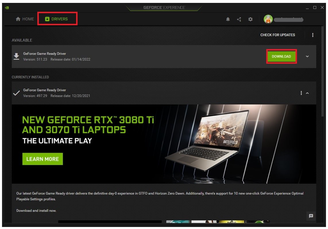 Aktiver den nyeNVIDIA billedskaleringfunktion til NVIDIA-grafikkortbrugere for at øge din FPS yderligere, når du spiller i høj opløsning. For at gøre det skal du brugeGeForce Experienceanvendelse. I applikationen skal du navigere tilChaufførerfanen. KlikDownloadfor at downloade og installere den nyeste NVIDIA-driver automatisk.