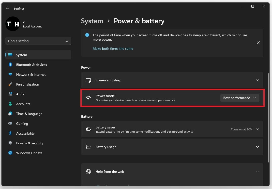 UnderStrøm og batteri, ændre dinStrømtilstandtilBedste præstation. Dette kan bruge mere strøm eller batteri, hvis du bruger en bærbar computer, men det anbefales at bruge denne tilstand, når den er tilsluttet en strømkilde for at rette potentiel forsinkelse på dit system.