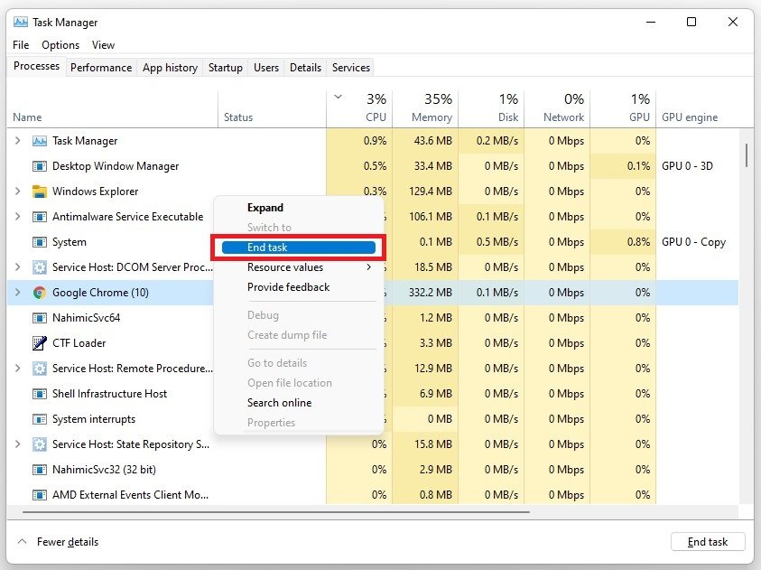 Åbn dinTask Managerved at søge efter det i din startmenusøgning. I dette vindue, iProcesserfanen, afslutte nogle programmer fra at køre på din pc, som kan bruge dine tilgængelige ressourcer, såsom Adobe-applikationer, OBS, Discord eller din browser, der kører i baggrunden.