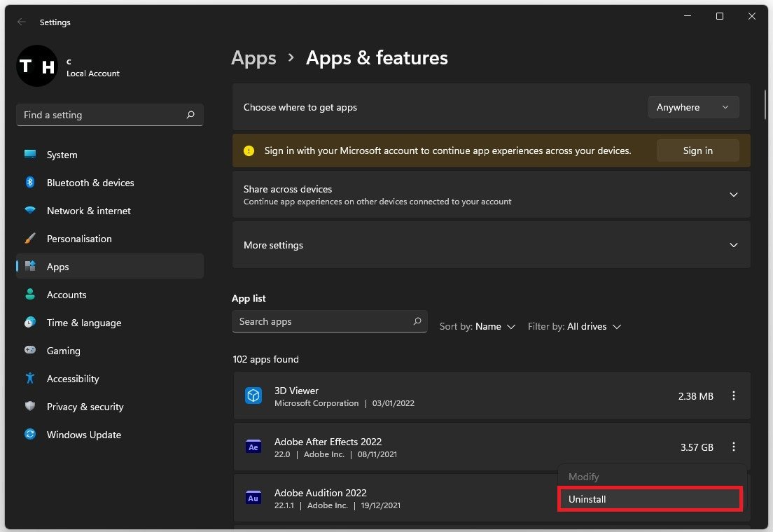 For yderligere at forbedre din Windows 11-ydeevne skal du afinstallere ubrugte applikationer og programmer på dit system. For at gøre det, søg efterAppsi din startmenu søg for at åbne dinApps og funktionervinduet med systemindstillinger. Søg efter specifikke apps, og filtrer dem efter drev på din pc. For at afinstallere et program skal du klikke på burgermenuen ud for appens navn og vælgeAfinstaller.