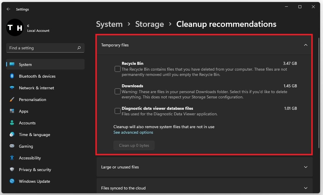 Systemindstillinger > Lager > Oprydningsanbefalinger