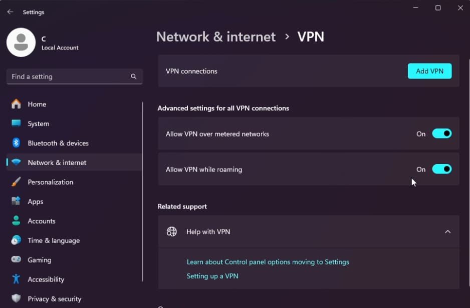 Windows-indstillinger > Netværk og internet > VPN