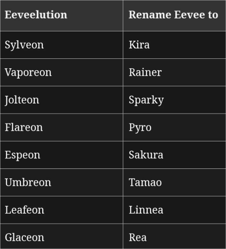 Trin 4.Indtast det specielle navn, der kræves for udviklingen (f.eks. "Tamao" for Umbreon).