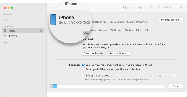 Når din iPhone er tilsluttet en pc eller en Mac, kan du finde serienummeret for din enhed i Finder eller iTunes. Sørg for, at din iPhone kan låses op med din iPhone-oplåsningskode. Brug derefter Finder eller iTunes til at få IMEI-nummeret på din iPhone med følgende trin.