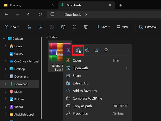 Gå nu tilbage til downloadmappen, højreklik på teksturpakkefilen og vælg kopi.