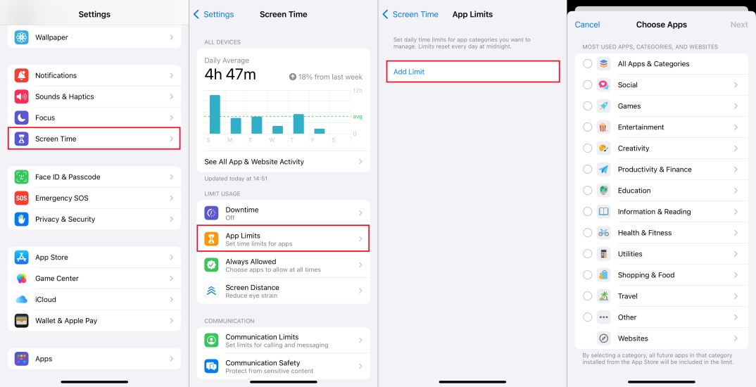 Trin 1.Få adgang tilIndstillingerapp og trykSkærmtid > Appgrænser.