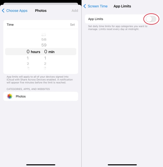 Ud over at låse Fotos-appen, kan du også indstille en tidsgrænse for Fotos-appen med en skærmtidsadgangskode. Hvis du har aktiveret skærmtid på din iPhone, kan du bruge App Limits-funktionen til at låse billeder på din iPhone, mens du bruger andre apps. Fotos-appen kan kun bruges inden for tidsgrænsen, og for yderligere brug skal du indtaste en adgangskode.