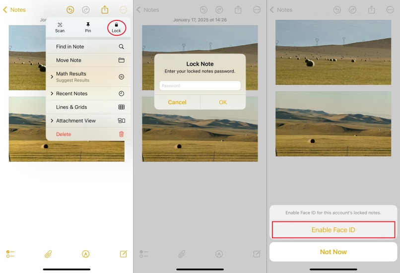 De fleste brugere ved, at Notes-appen er nyttig til at tage noter, men ignorer, at det er et andet kraftfuldt værktøj til at låse billeder. Denne metode giver dig mulighed for at sikre individuelle billeder eller samlinger med Face ID, Touch ID eller en adgangskode. Med Notes-appen kan du i stedet for at gemme dine billeder i Fotos-appen gemme dine billeder i en enkelt note eller flere noter.