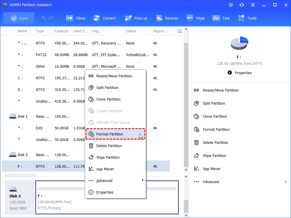 Trin 2.Højreklik på målpartitionen og klik på "formatFormatering vil slette alle data og forårsage tab af data. Sikkerhedskopier dine vigtige data på forhånd.