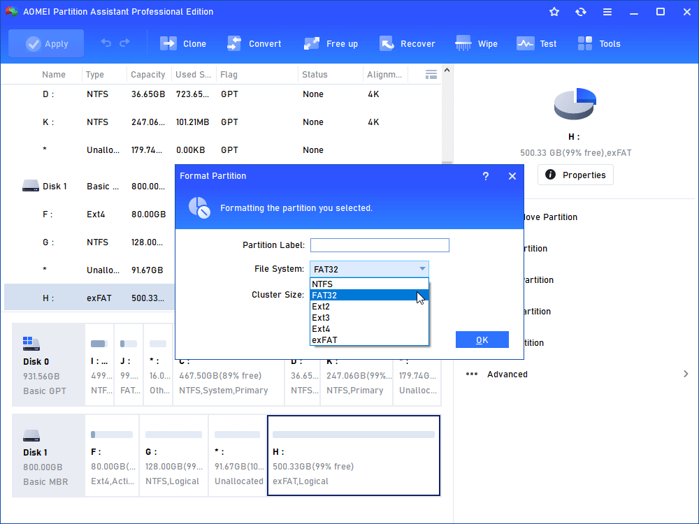 Når du forsøger at formatere exFAT til FAT32, vil metoder som Disk Management, CMD eller File Explorer ikke være tilstrækkelige, hvis exFAT-partitionen overstiger 32 GB. IEMOA Partition Assistant kan dog overvinde denne begrænsning og hjælpe dig med at formatere til FAT32 med lethed. Kom med os for at se, hvordan det fungerer.