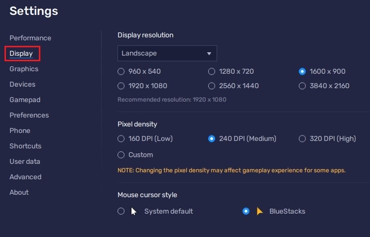 I dinSkærmindstillinger, jeg kan godt lide at bruge en opløsning på1920 x 1080, men du kan indstille dette til alt, hvad du vil. Du kan lade de andre indstillinger blive til deres standardindstilling og spille 8 Ball Pool Mobile for at se, hvor godt det kører på din pc.