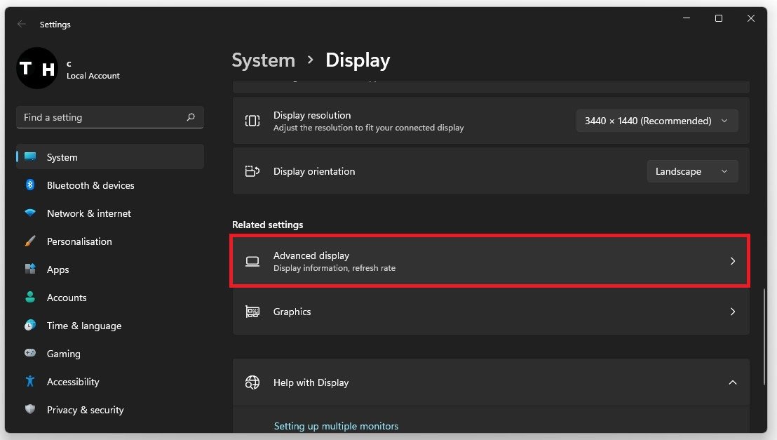 Sørg for, at det korrekte display er valgt, rul ned, og klik påAvanceret skærm.