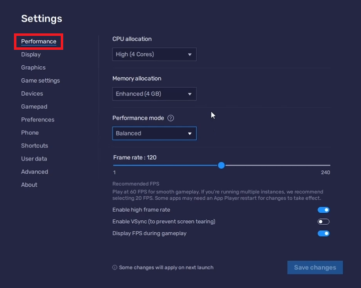 Høj FPS-indstillinger:Aktiver muligheden for høj FPS for at synkronisere emulatorens billedhastighed med din skærms opdateringshastighed, hvilket giver jævnere billeder.