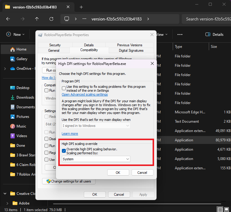 Roblox-egenskaber > Kompatibilitet > Tilsidesættelse af høj DPI-skalering