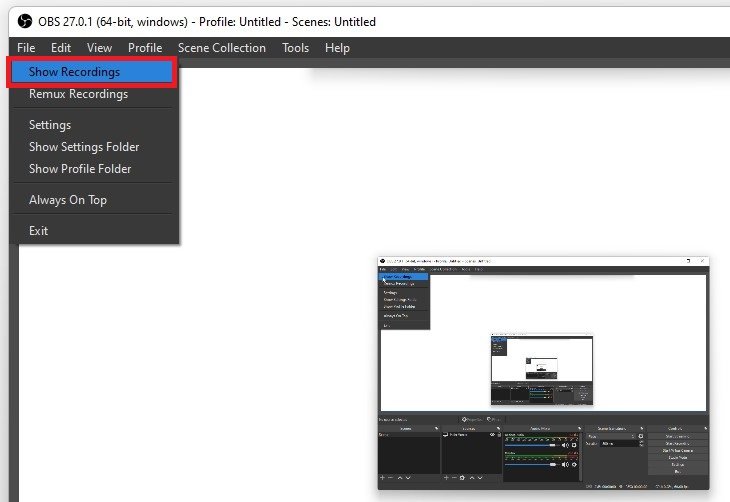 For at optage dit Roblox-gameplay skal du vælgeStart optagelse, ogStop optagelseigen når du er færdig. Når du navigerer tilFil, kan du vælgeVis optagelser, som åbner din standardmappe, hvor OBS-optagelser vil blive gemt.