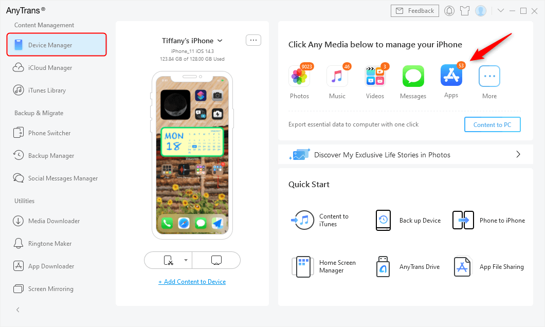Trin 1. Gratis download AnyTrans på din computer og start den > Tilslut din iPhone til computeren med et USB-kabel > Tryk på Apps-ikonet i højre kontrolpanel i Enhedshåndtering-grænsefladen.
