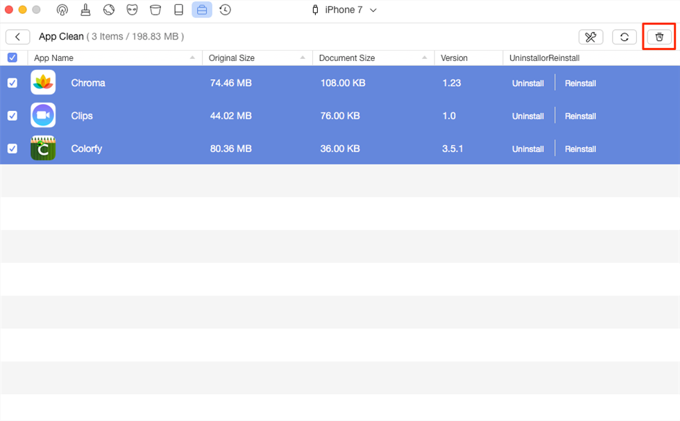 Trin 3. Vælg dine uønskede apps, og klik på Papirkurv-ikonet i øverste højre hjørne for at fjerne de valgte apps fra din iPhone 7.