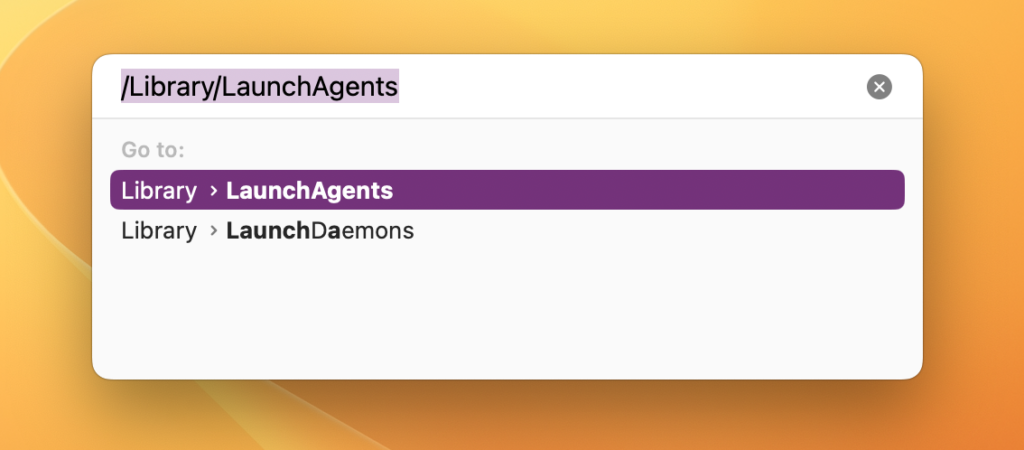 2) IGå til mappe...bar, type/Library/LaunchAgents, og dobbeltklik derefterBibliotek > LaunchAgents.
