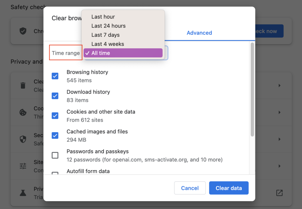 3) KlikFremskreden, og sørg derefter forBrowserhistorik,Download historie,Cookies og andre webstedsdata, ogCachelagrede billeder og filerer alle valgt.